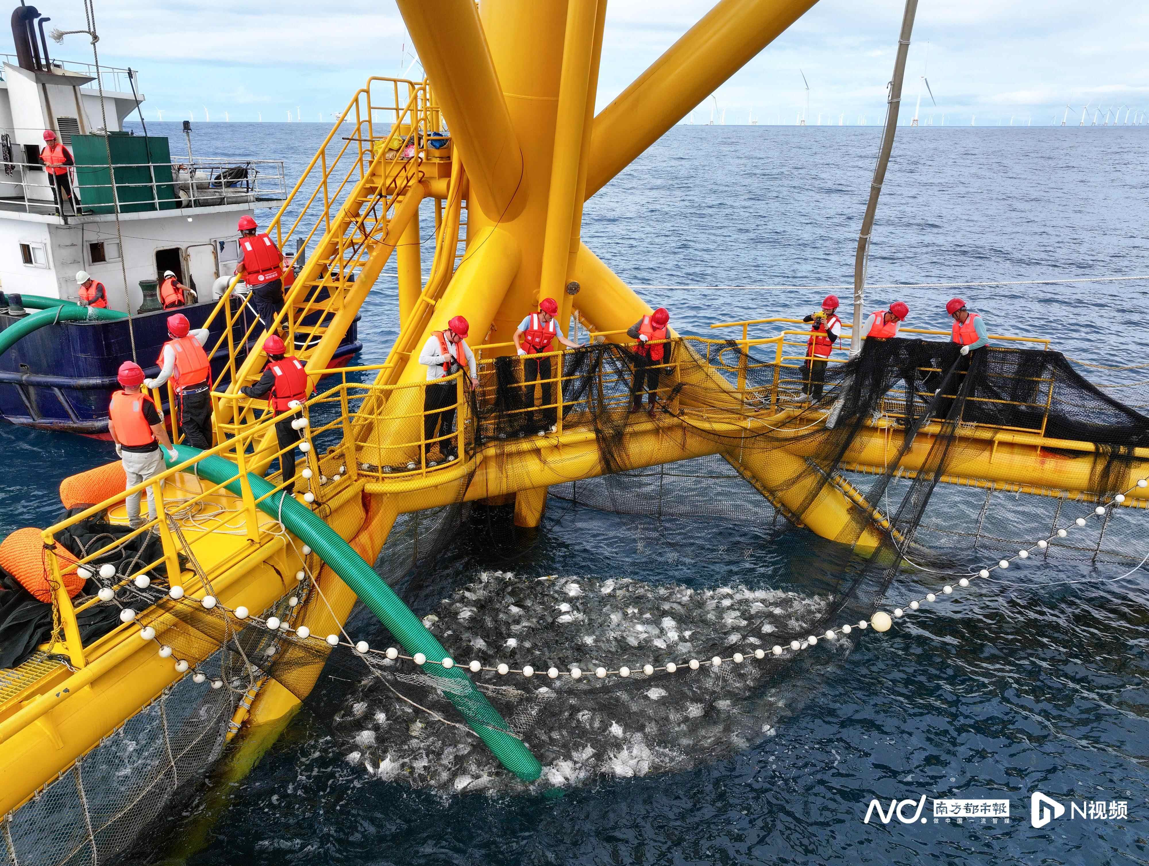 2023年11月10日,明阳阳江青洲四项目全球首创的“发电+养鱼”项目成功“撒下了第一网”,收鱼近5000公斤。阳江日报记者 梁文栋 摄