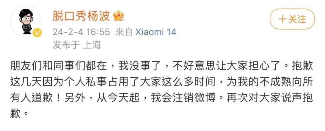 2月4日,脱口秀演员杨波发布动态,为最近出轨和疑似轻生事件引热议道歉,并表示会注销微博账号。相关话题迅速登上热搜榜。