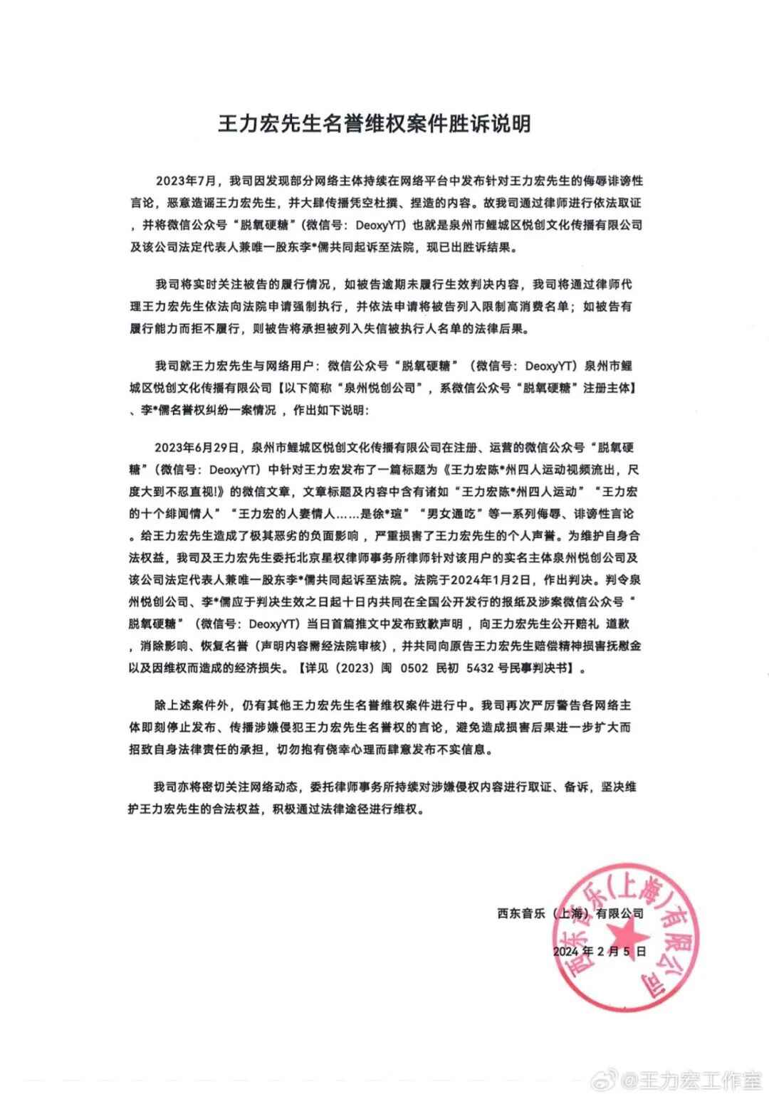 2023年7月,我司因发现部分网络主体持续在网络平台中发布针对王力宏先生的侮辱诽谤性言论,恶意造谣王力宏先生,并大肆传播凭空杜撰、捏造的内容。故我司通过律师进行依法取证并将微信公众号“脱氧硬糖”(微信号:DeoxyYT)也就是泉州市鲤城区悦创文化传播有限公司及该公司法定代表人兼唯一股东李*儒共同起诉至法院,现已出胜诉结果。