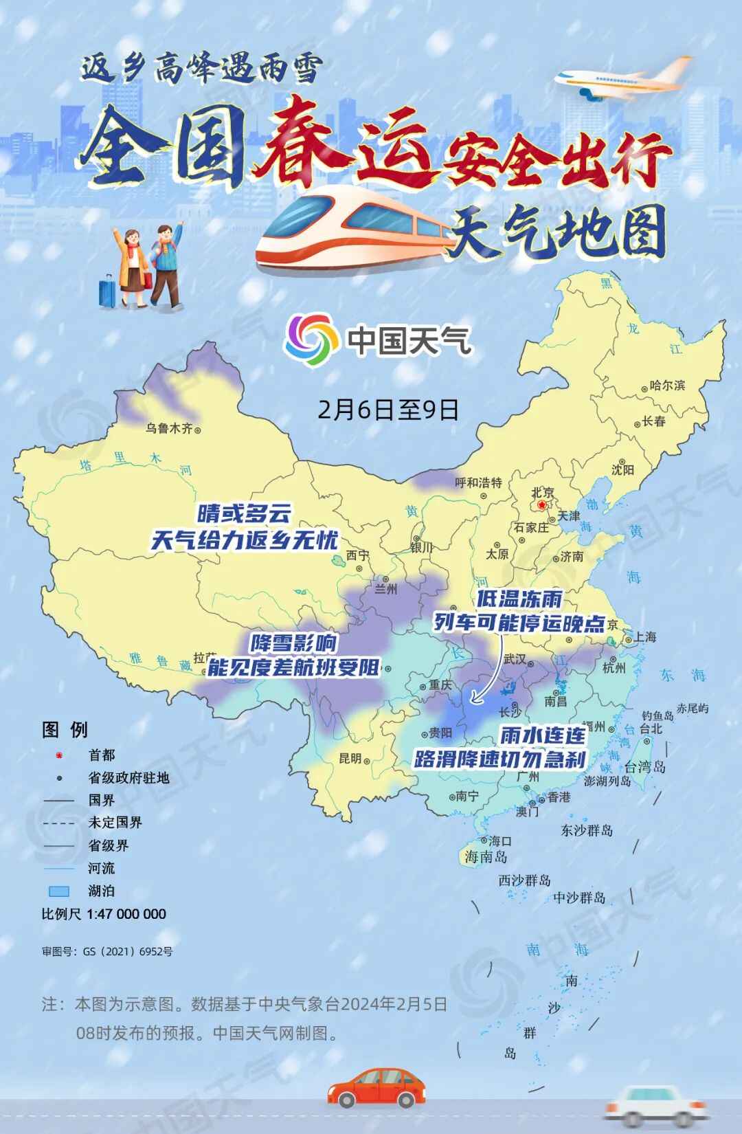 眼下正值节前返乡高峰期,预计今天(2月5日)至除夕当天,北方雨雪天气明显收敛,但南方大范围雨雪天气将持续至除夕前,降水相态复杂,部分地区还将出现冻雨,对交通影响依然较大。中国天气网推出全国春运安全出行天气地图,看看返乡高峰哪些天气会阻碍你的回家路,还有雨雪冰冻天气出行指南助你平安到家。