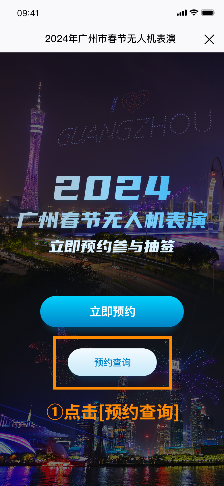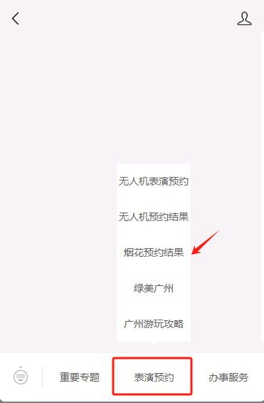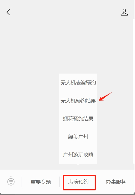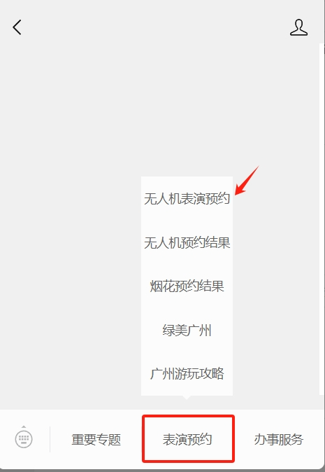 搜索关注“中国广州发布”微信公众号,点击主页菜单栏“表演预约——无人机表演预约”进入预约页面。