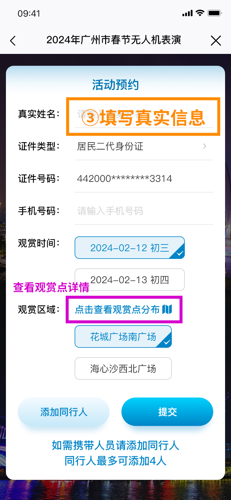 预约时可自行选择观赏区域(花城广场南广场、海心沙西北广场),中签后由系统分配预选观赏点,请按照中签信息提前安排行程,按时进入指定观赏点。中签预约单不可转让出售。