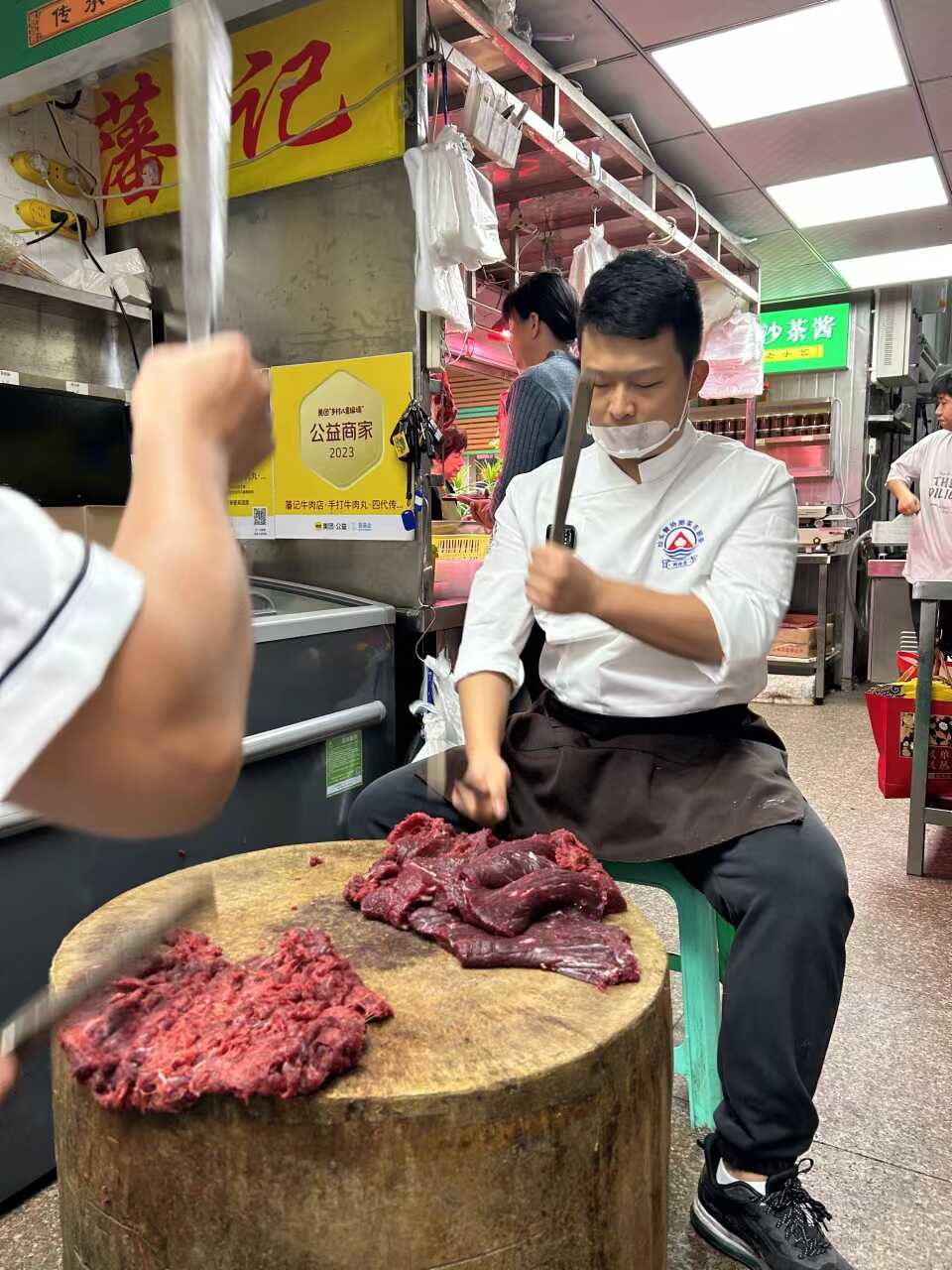 说起手打牛肉丸的制作,柯林滨如数家珍。只见柯林滨手执特制的方形锤,一边在肉块上上下下捶打,一边说:“尽管没有什么标准限定使用的牛种,但是行业人士心中早已有了一把尺,黄牛是目前最适合用来制作牛肉丸的牛种。”