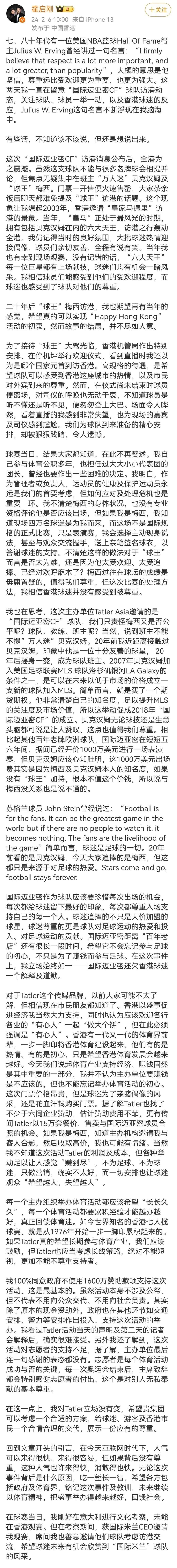 同日,霍启刚在个人微博发布长文表示:我们为球队到来准备的精心安排,却被狠狠践踏,令人遗憾。希望可以考虑一个合适的方案,给球迷、游客及香港市民一个合情合理的交代,展示一份应有的尊重。