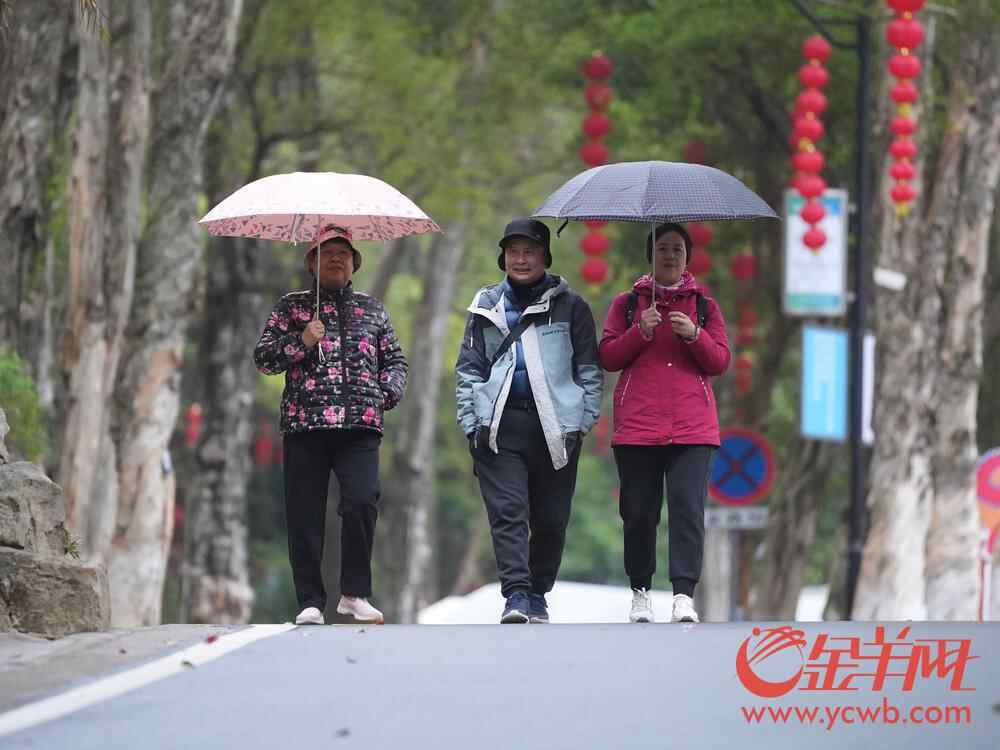 2月7日早上,市民游客撑雨伞穿厚衣赴广州白云山参观园博会