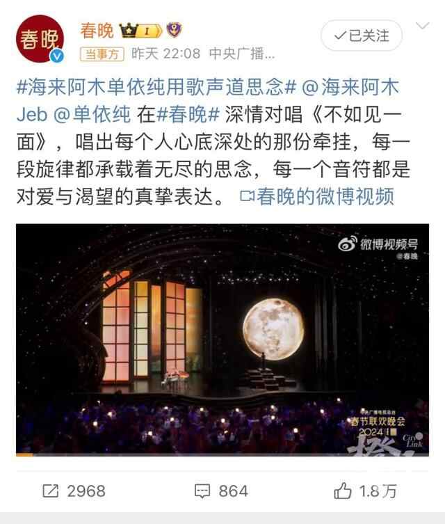 来自浙江音乐学院流行音乐系的大四学生单依纯,再次登上央视春晚舞台,与来自四川凉山的海来阿木,深情对唱了一首《不如见一面》。