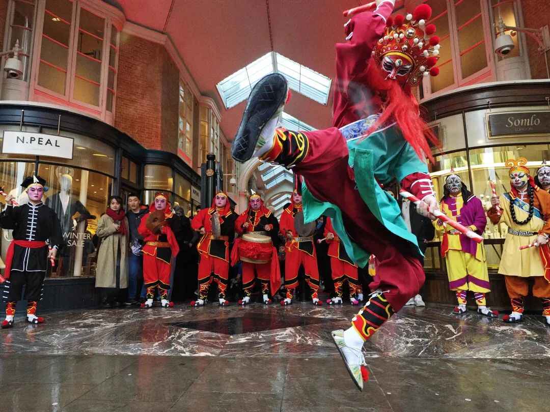 普宁南山英歌队在英国伦敦伯灵顿拱廊街进行快闪演出。于果 摄