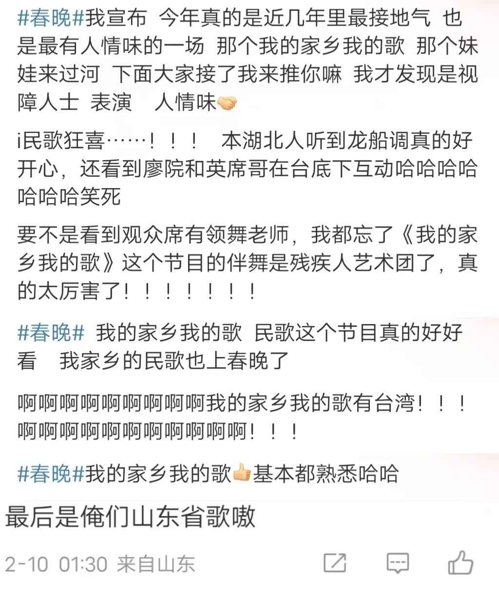 5分58秒演唱10首民歌,歌声要此起彼伏,调度要行云流水,更多细节需要一点一点地抠。从开场《太阳出来喜洋洋》的云开雾散,到《谁不说俺家乡好》的自豪收尾,大家耳熟能详的民歌充满生命力和人情味,展现出这些广为流传的曲调里静水流深的文化力量,也深深唱到了网友的心坎里。