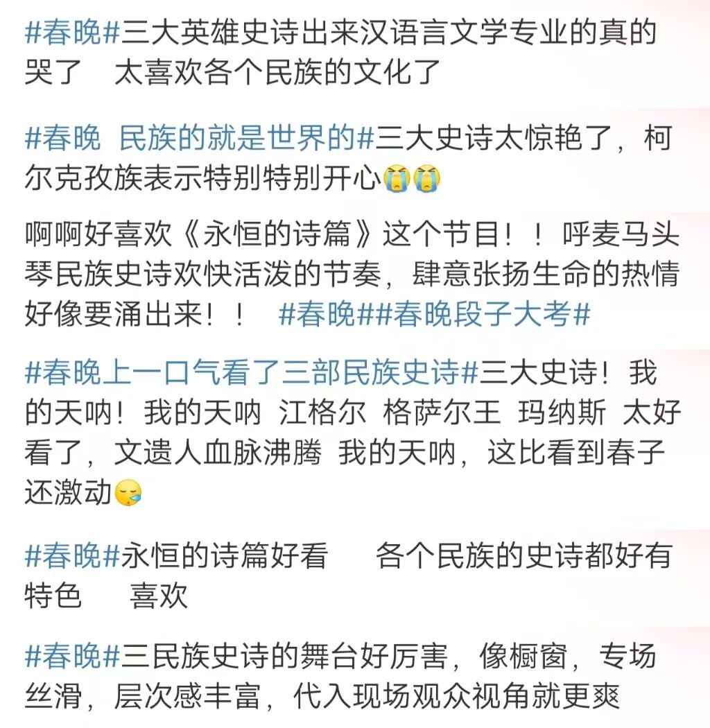 在总台春晚这个全球关注的中国电视盛会上,三部英雄史诗的高燃表演带来一场震撼人心的视听盛宴。正如一位网友所说,不同民族的故事,不同语言的颂歌,但又是这么融洽、和谐、统一,在文明千年的流转之中汇成一首永恒的诗篇。