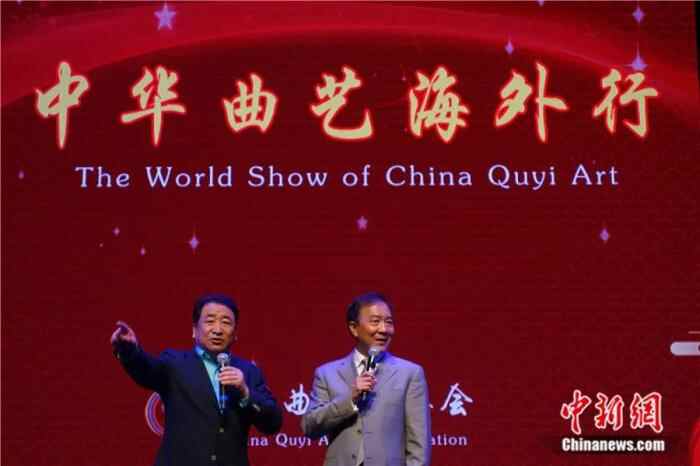 2019年3月18日晚,相声表演艺术家姜昆(左)和戴志诚在阿根廷布宜诺斯艾利斯星光大剧院表演相声。莫成雄 摄
