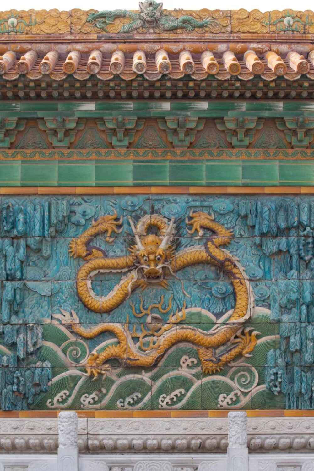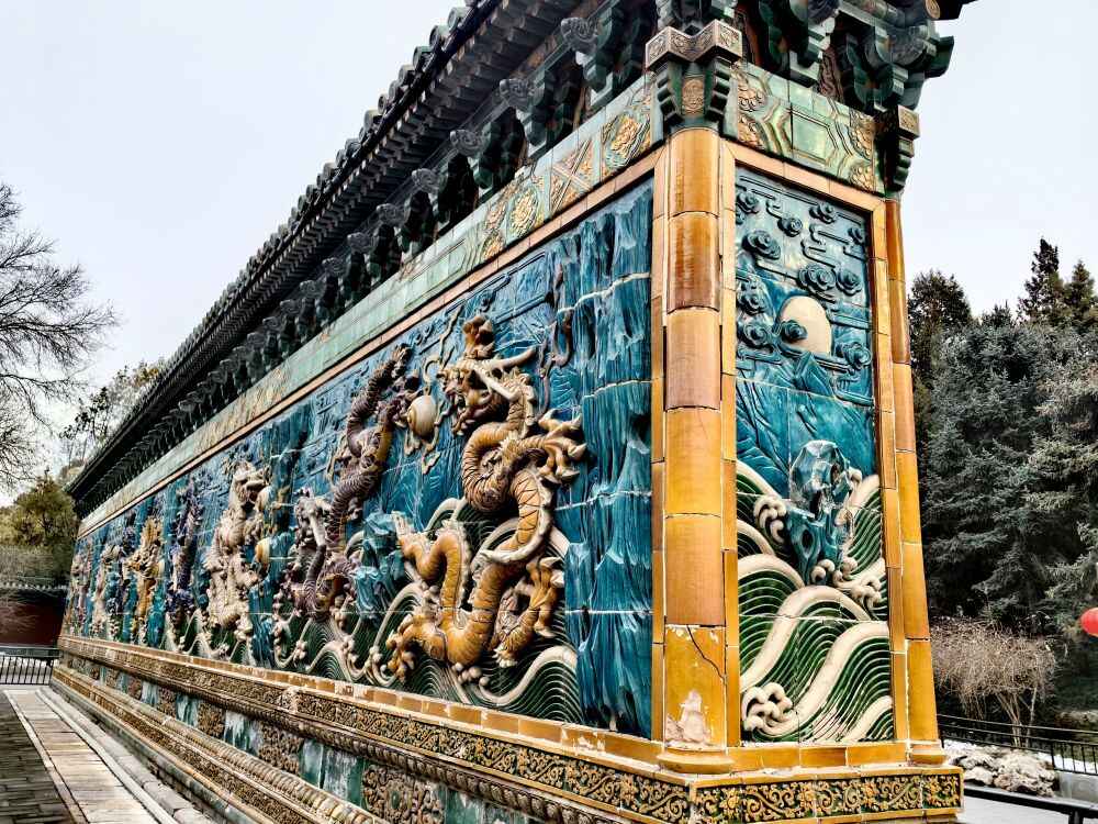 北海公园九龙壁是三大九龙壁中唯一的双面龙壁。它南北两面各有九条体型较大的龙,龙鳍随龙身翻转,龙爪的骨骼结构被塑造得细致入微,再加上壁的正脊、岔脊等处,其上共有600多条大小各异的龙。