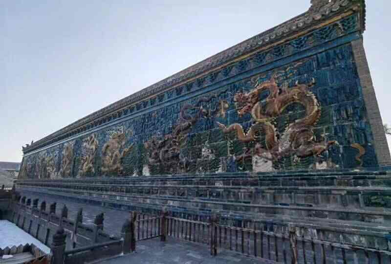 大同九龙壁在中国三大九龙壁中规模最大、历史最悠久。45.5米长的龙壁上,九条巨龙在云海波涛间奔腾了600余年,雄健勇猛,桀骜不驯。壁前有一长方形倒影池,春暖花开时,飞龙倒映水中,水动龙游,妙趣横生。