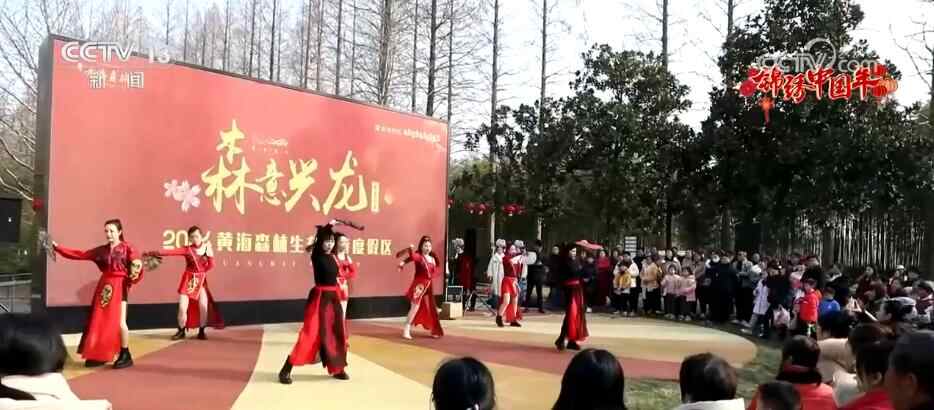在位于江苏盐城的黄海国家森林公园,活动也精彩纷呈。在龙年集市里,除了满足味蕾的美食摊位,还有糖画、捏泥人、剪纸等非遗体验活动。舞台上,舞蹈、歌曲、魔术等精彩节目接连上演,游客们沉浸在浓浓的节日氛围里。