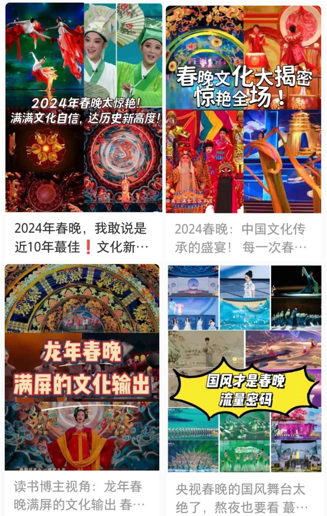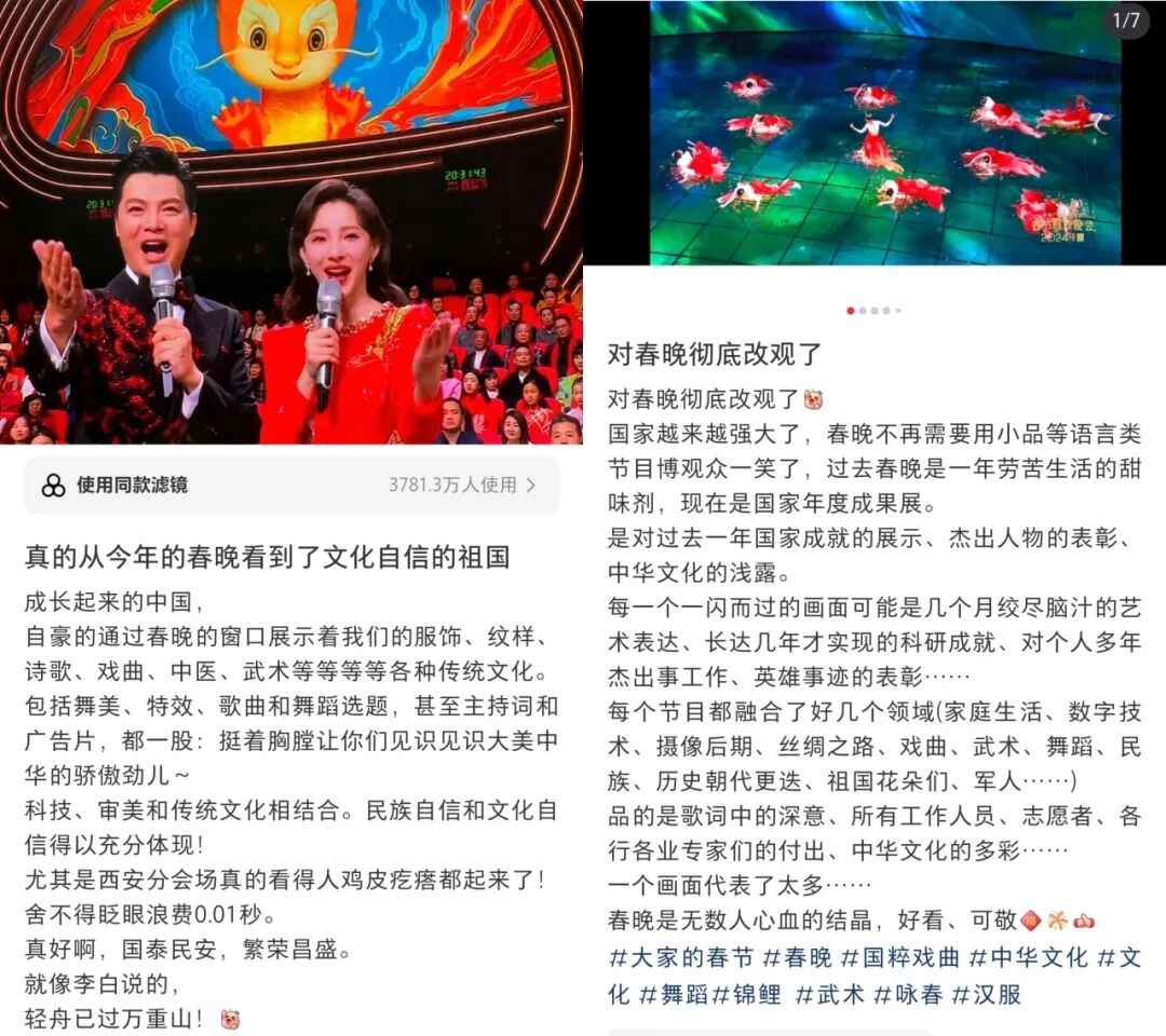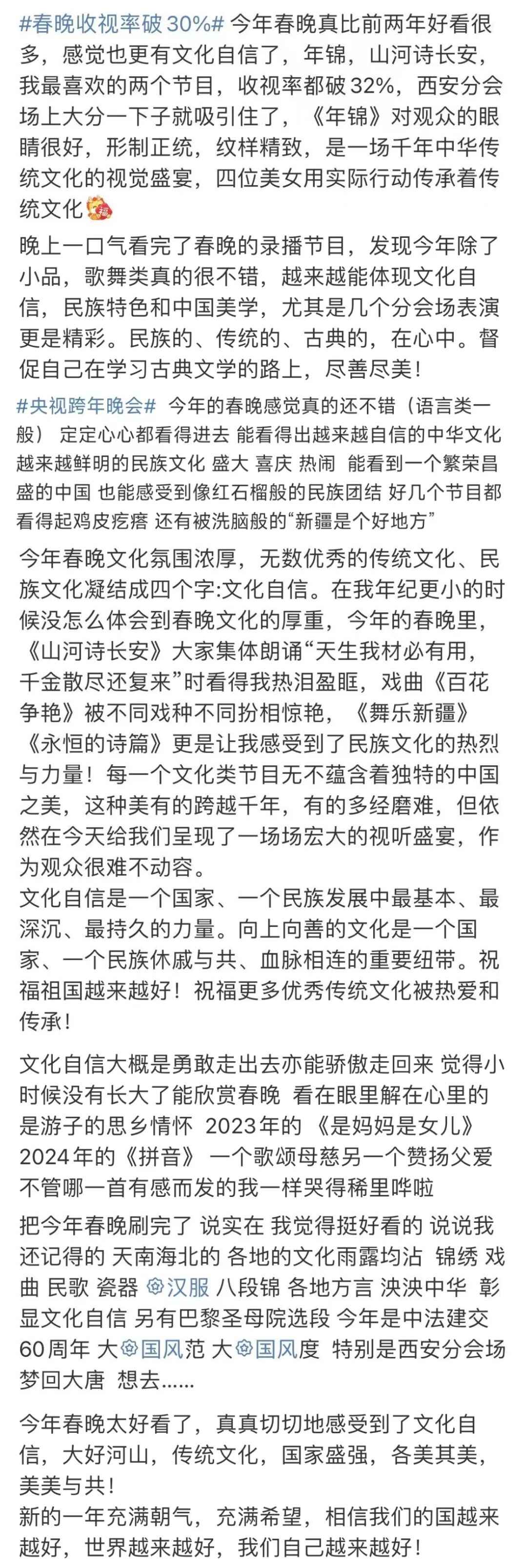 春晚的文化展现,在国人中也引起了热烈反响。“每一个文化类节目都蕴含着独特的中国之美,这种美有的跨越千年,有的多经磨难,春晚给我们呈现了一场场宏大的视听盛宴,作为观众很难不动容”“从今年春晚真真切切地感受到了文化自信,大好河山,传统文化,国家强盛,美美与共”“文化传统特色给各个节目都刷了创意的漆,霸气从节目中升腾,自信从感叹中生发,真妙”......