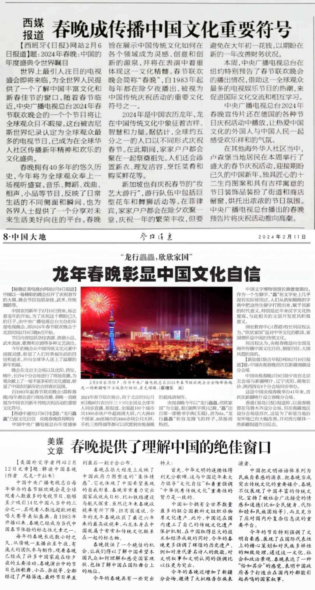 《参考消息》援引西班牙媒体评论称,总台龙年春晚为全世界人民提供了一个了解中国丰富文化的窗口,它展示中国传统文化如何在各个领域成为灵感、创意和创新的源泉,并在音乐、舞蹈、戏曲等节目中体现传统文化的精髓。秘鲁、新加坡等媒体报道称,龙年春晚彰显了中国的文化自信。而美国《外交学者》网站署名文章认为,龙年春晚为世界提供了理解中国的绝佳窗口。海外媒体的这些报道,不约而同地使用了“文化符号”“标志性元素”等词汇,并从促进文化理解、推动文化交流等角度对总台春晚的海外影响力进行解读。