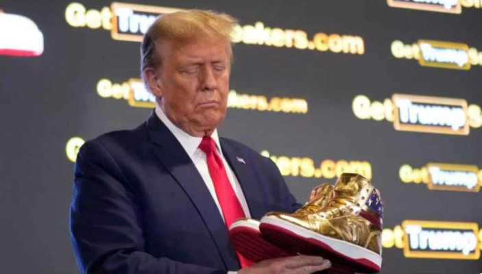 这双金色高帮鞋背面印有美国国旗图案,在一个新网站上以399美元的价格出售。该网站自称与特朗普的竞选活动没有关系。