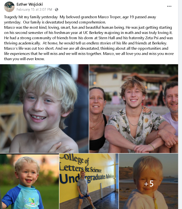 据多家美国媒体报道,拥有7亿美元身家的美国知名亿万富豪苏珊·沃西基,近日迎来了一个令她悲痛欲绝的消息:她19岁的儿子马可·特罗珀被发现死在了美国著名的加州大学伯克利分校校内。