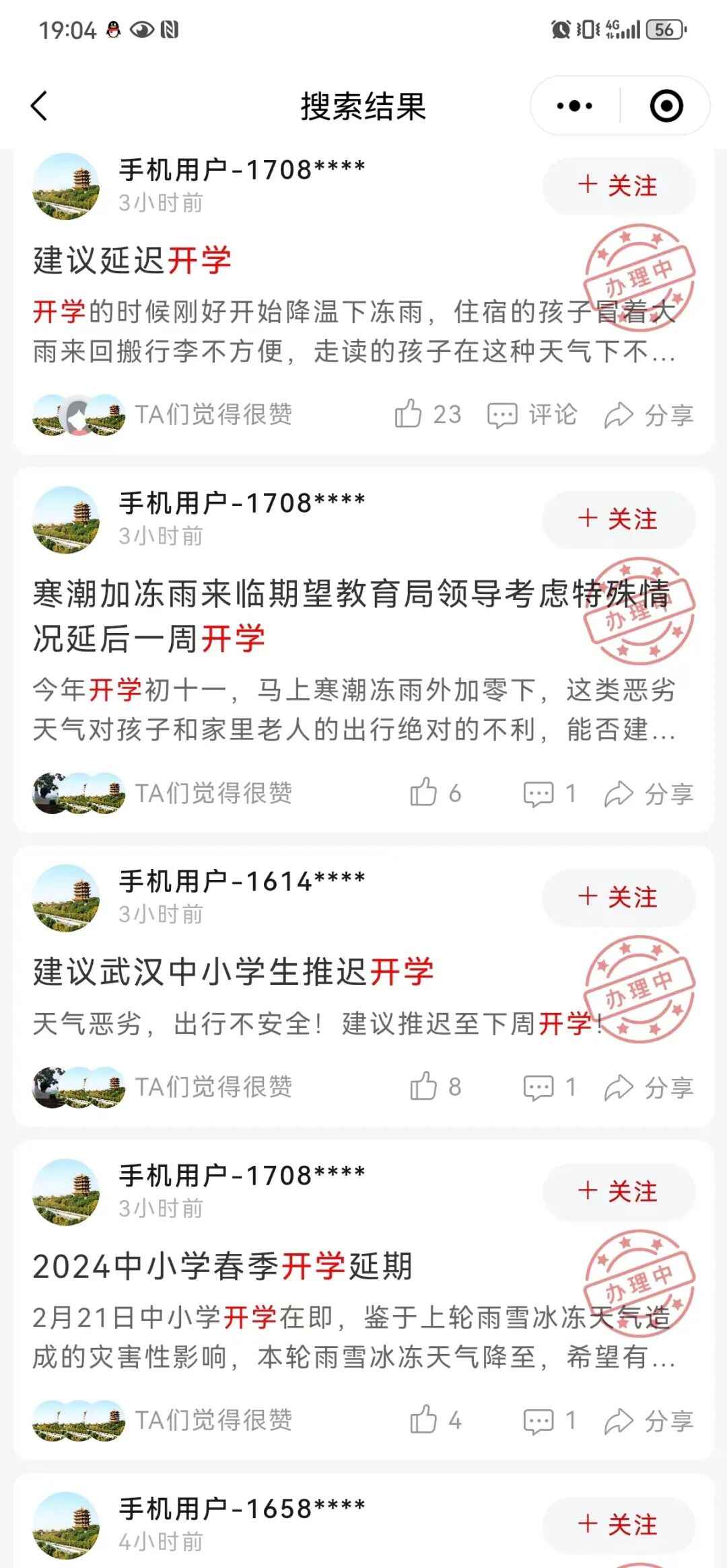 有市民在武汉城市留言板上建议:“2月21日中小学开学在即,但雨雪天气也随之而来……希望有关部门依据天气适当调整返校时间。”