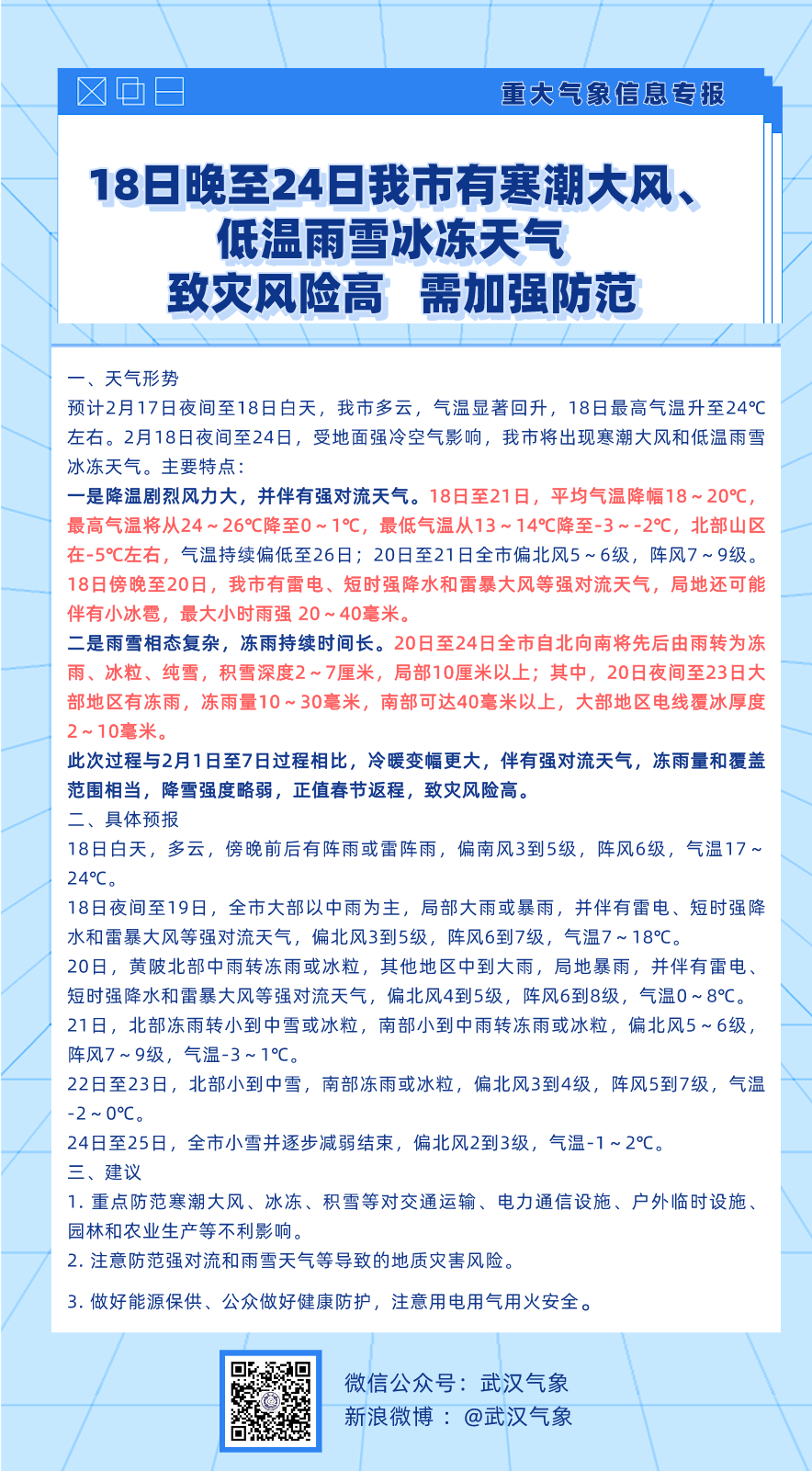 但在18日,武汉市气象台发布寒潮橙色预警,18日夜间至24日,受地面强冷空气影响,武汉将出现寒潮大风和低温雨雪冰冻天气。18日夜间至21日,武汉市大部分地区平均气温下降18℃~20℃,22日早晨最低气温下降至-3℃~-2℃。