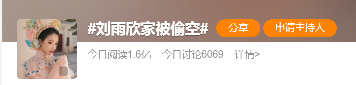 2月19日,刘雨欣在社交平台发文称她带家人出门旅行归来,发现家被偷空了,几十年奋斗的家当一扫而空,珠宝、手表、包、现金、钱包、卡等加起来几千万的损失。他们已向当地警方报案,但目前没有进展。