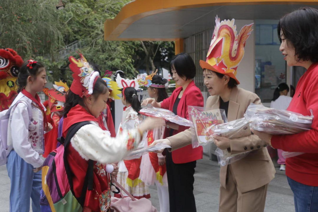 传统文化中,“龙”是智慧、勇气的化身,当这一意向遇上被家长寄予“成龙成凤”期待的孩子时,便更加有了美好的寓意。开学第一天,“龙”元素在校园内随处可见。在越秀区东风东路小学,孩子们身着红色的古典的衣裳,头戴手工制作的龙头饰,老师、少先队的同学和舞狮队早早就在此等候,有的同学戴着罩满整个脑袋的龙头饰,笑盈盈地冲向老师们,老师亲切地问候同学,并递出新年礼物“福禄寿禧龙”。