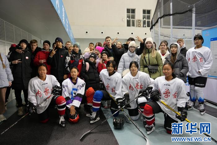 寻迹万里茶道中俄游学活动中,俄罗斯师生与冰球运动员们在内蒙古自治区冰上运动训练中心合影留念。 新华网发 李朕滨 摄