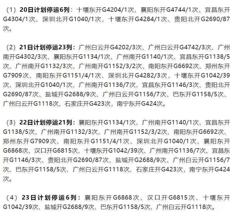 受我国大部将遭遇大范围雨雪天气的影响,广深部分列车停运。据广铁集团消息,为确保旅客运输安全,铁路部门启动应急响应,对途经河南中南部、安徽北部、湖北和湖南北部等地区部分列车采取停运措施,预计20日至23日共停运列车56列。另据@武汉铁路消息,20日和21日,武汉、武昌、汉口三站每天超130趟列车停运,包括往广州方向部分列车。因列车停运导致旅客退票时,旅客可自列车停运信息公布时起至车票乘车日期后30日以内办理退票手续,不收退票费。