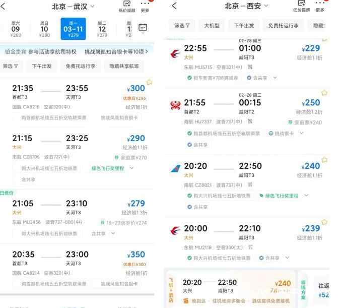 据携程数据,目前至2月底,上海飞重庆、长沙、西安、成都、三亚等地,均有百元机票。从目前至3月中旬,北京飞西安、重庆、武汉、洛阳等地,均有两三百元机票。此类特价机票,主要受供需关系影响,热门城市在春季出游高峰过后,游客流量快速下降,航空运力出现过剩的情况。2、3月份,用户有较大概率捡漏到此类特价机票。