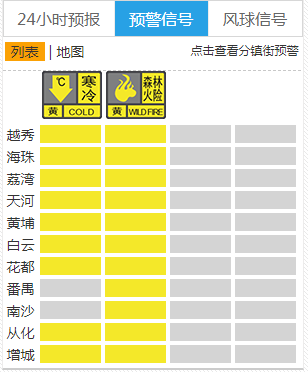 2月21日17时25分,广州市气象台对越秀、天河两区发布寒冷黄色预警信号。截至21日18时10分,除番禺、南沙外,广州9区已发布寒冷黄色预警信号。