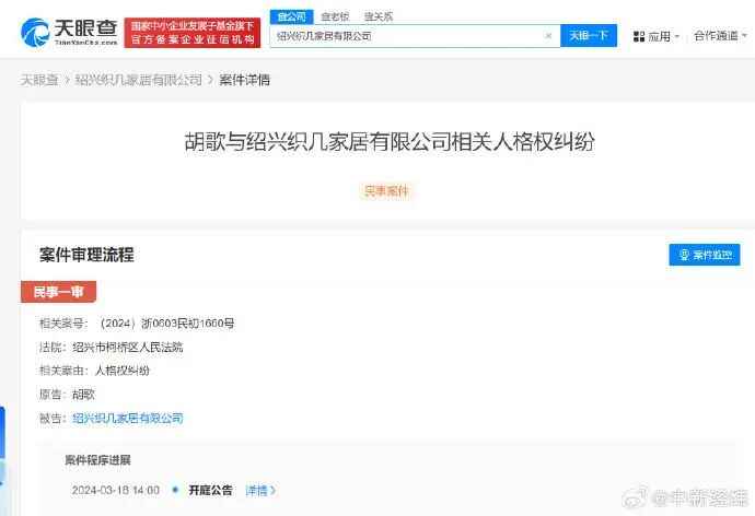 天眼查法律诉讼信息显示,近日,胡歌与绍兴织几家居有限公司相关人格权纠纷案件新增开庭公告,原告为胡歌,该案将于3月18日在绍兴市柯桥区人民法院开庭审理。