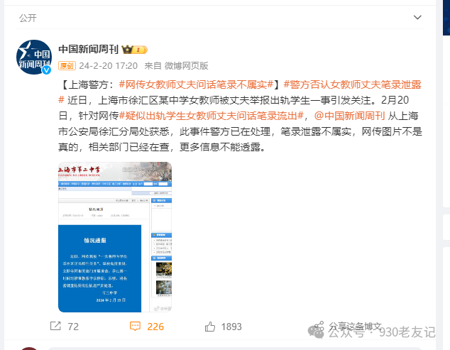 2月19日,疑似出轨女教师张某丈夫问询笔录图片在多个社交媒体账号上流传。网传图片显示,该笔录时间为2月19日,被问询人是一名吴姓男子。该吴姓男子声称,在网上爆料张某出轨后,他已准备离婚。