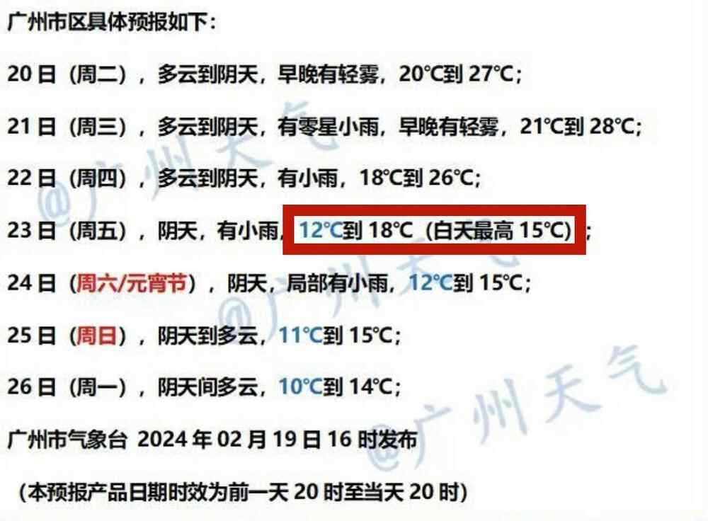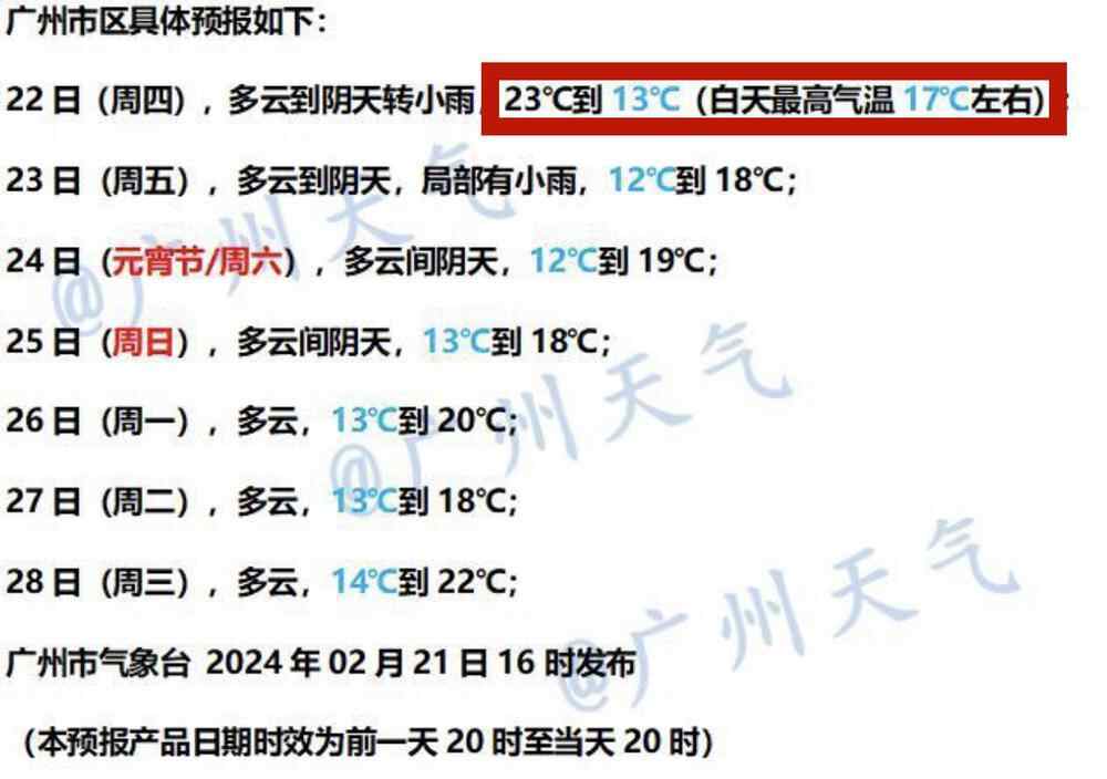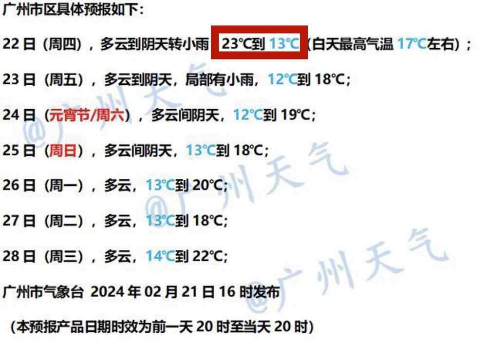 留意广州市气象台天气预报的市民和网友,会注意到该台近期多天有关2月22日的最低及最高气温预报旁,用括号标注“白天最高气温”。在21日傍晚的市区七天预报中,在22日预计最高气温21℃及最低气温13℃旁特别标注“白天最高气温17℃左右”;21日上午的会商预报结论,则特别标注22日“白天最高气温17~18℃”。