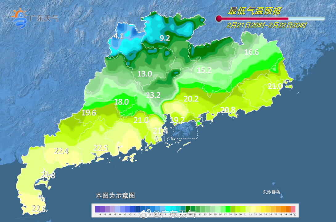 ◆强冷空气前锋21日晚起影响广东,22日中午开始影响广州市区。预计22-23日,韶关、清远、肇庆有小到中雨局部大雨(高海拔山区局部有冻雨或雨夹雪),其余市县多云间阴天,有分散小雨。气温明显下降,最低温:韶关、清远3~6℃(高海拔山区零下1~2℃,局部有冰冻),河源北部、梅州北部和肇庆北部7~10℃,南部沿海16~20℃,其余市县10~15℃。详情-->