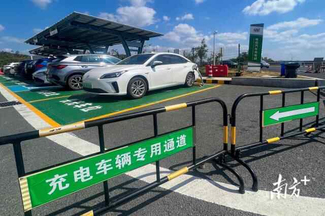 广龙高速公路上的蓝塘服务区,设置有充电车辆专用通道。南方+记者 朱洪波 摄