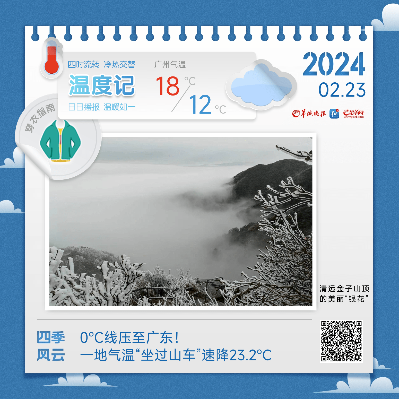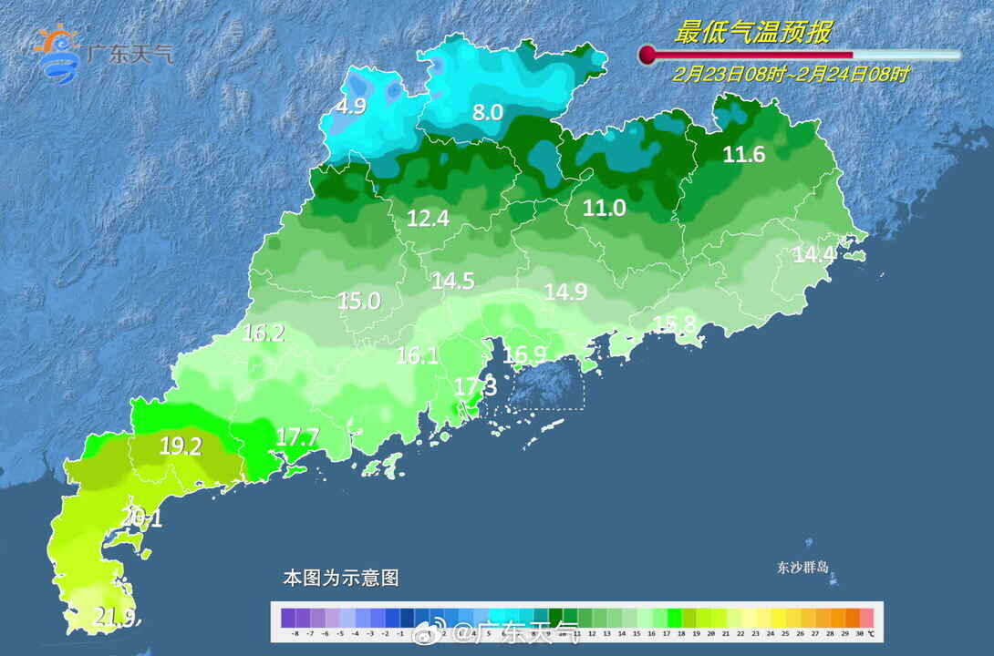 23日,韶关、清远、肇庆阴天有小雨局部中雨(高海拔山区局部有冻雨和冰冻),其余市县多云间阴天有分散小雨。最低气温:韶关、清远2~6℃(高海拔山区零下3~0℃,局部有冰冻),河源北部、梅州北部、肇庆北部7~10℃,南部沿海16~20℃,其余市县10~16℃。