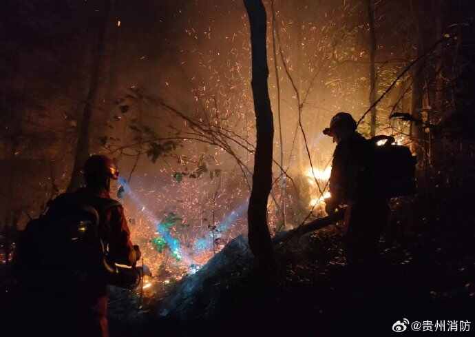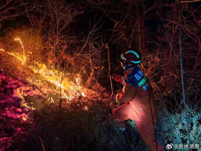 在无情山火面前,消防战士奋战一线,民间志愿团队和贵州当地群众也自发支援消防战士灭火,献上自己的一份力。