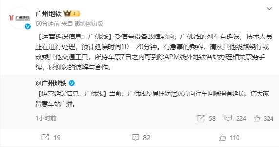 今天8时许,@广州地铁 发布运营延误信息:受信号设备故障影响,广佛线的列车有延误,技术人员正在进行处理,预计延误时间10—20分钟。有急事的乘客,请从其他线路绕行或改乘其他交通工具,所持车票7日之内可到除APM线外地铁各站办理相关票务手续。