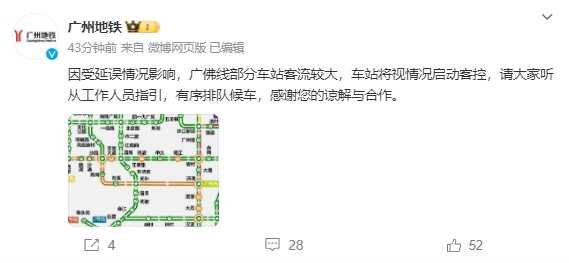 随后,@广州地铁 再发消息:因受延误情况影响,广佛线部分车站客流较大,车站将视情况启动客控。