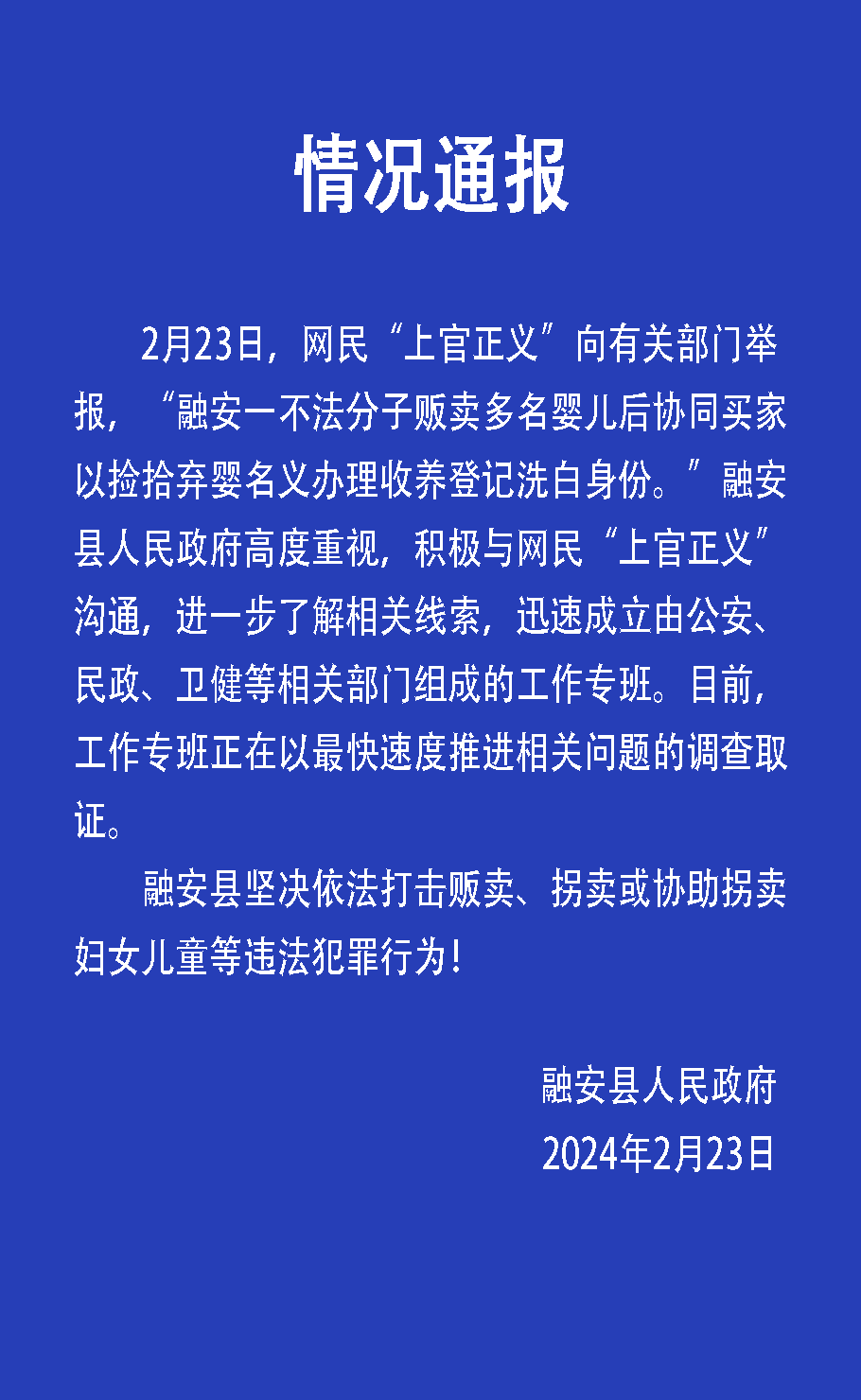 2月23日,网民“上官正义”向有关部门举报,“融安一不法分子贩卖多名婴儿后协同买家以捡拾弃婴名义办理收养登记洗白身份。”2月23日,广西柳州市融安县人民政府发布情况通报: