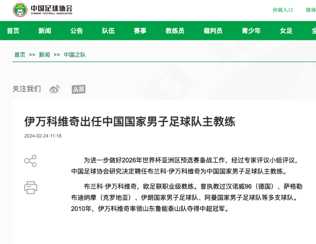 据中国足球协会2月24日发布:为进一步做好2026年世界杯亚洲区预选赛备战工作,经过专家评议小组评议,中国足球协会研究决定聘任布兰科·伊万科维奇为中国国家男子足球队主教练。