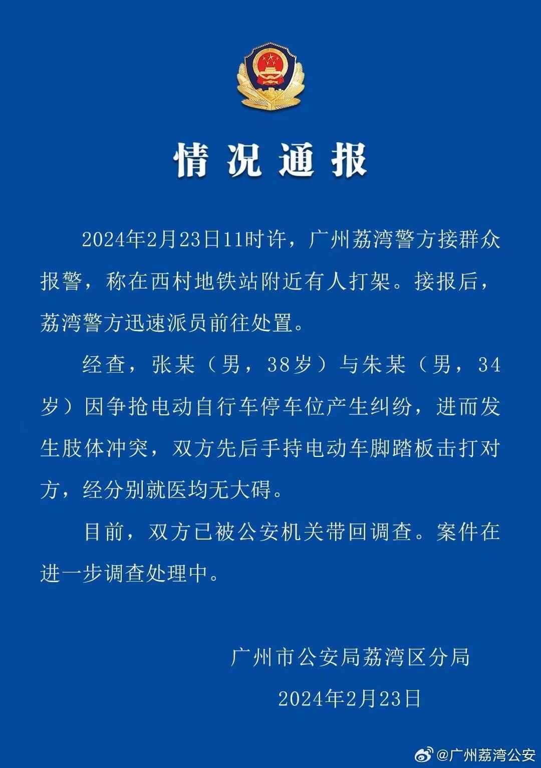 2月23日,有传言称“广州西村地铁站出口发生砍人事件”。记者从广州荔湾警方获悉,传言不实,实则为两男子因争抢电动自行车停车位产生纠纷,双方先后手持电动车脚踏板击打对方,均无大碍。