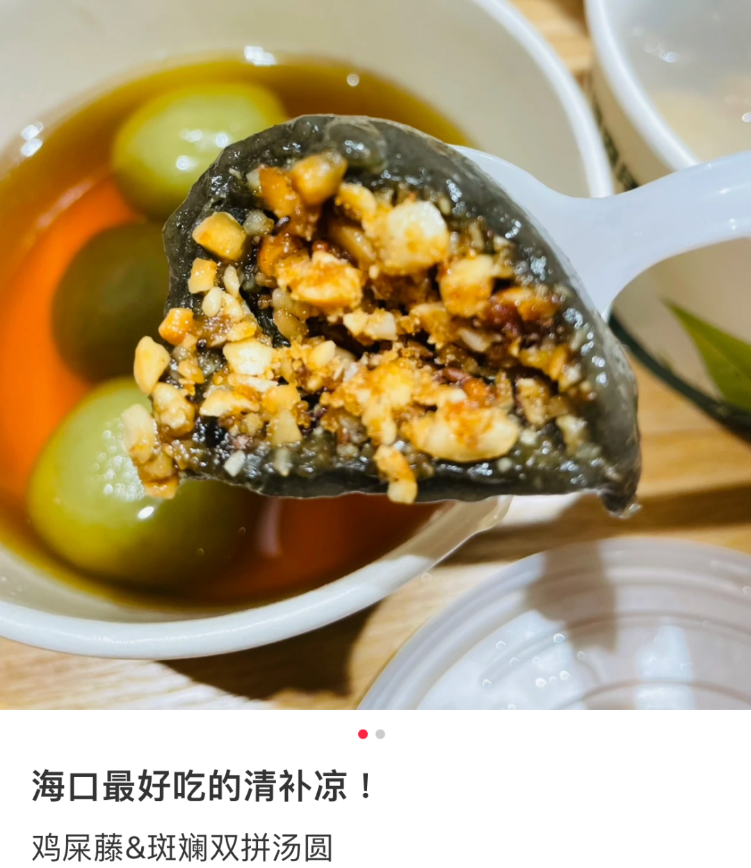 这汤圆,看名字着实会给人吓一跳。别怕!真不是“鸡屎馅”的,而是鸡屎藤馅的。它是海南地区特有的一种汤圆,主要原料为鸡屎藤、糯米粉、白砂糖等。