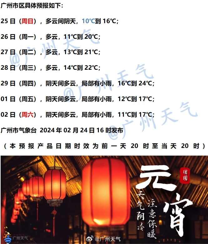 @广州天气预计,25日(周日),多云间阴天,10°C到 16°C;26日(周一),多云,11°C到20°C。