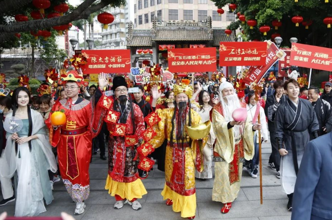 广东石湾酒厂方阵组成汉服文化方阵,方阵成员身穿精美汉服,排头的“福禄寿”三星引发许多市民游客拍照围观。
