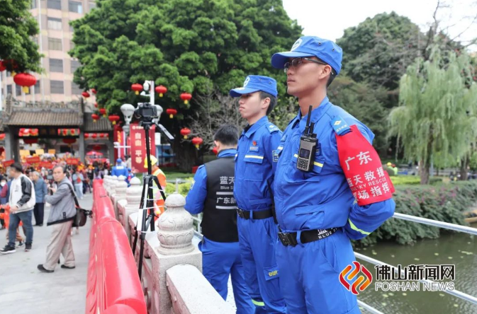 广东蓝天救援队成员在行通济现场分点站岗,守护市民群众的“安全线”。