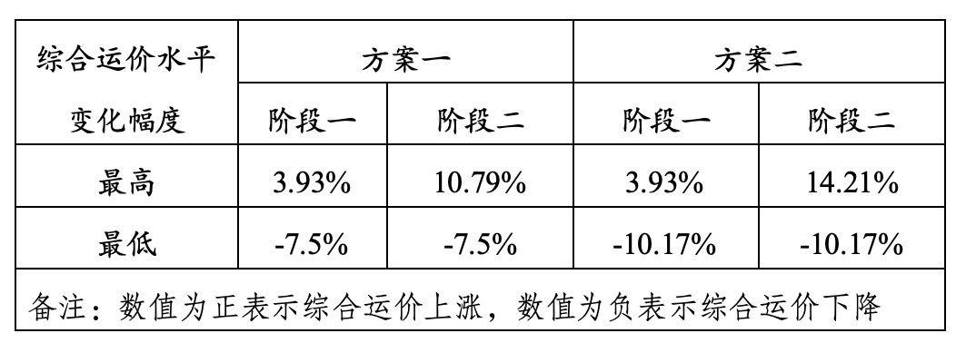 答:(一)改革对总体运价水平影响有限。特别是第一阶段,两个方案的上涨幅度都控制在3.93%以内,而下降幅度则可以达到7.5%~10.17%。