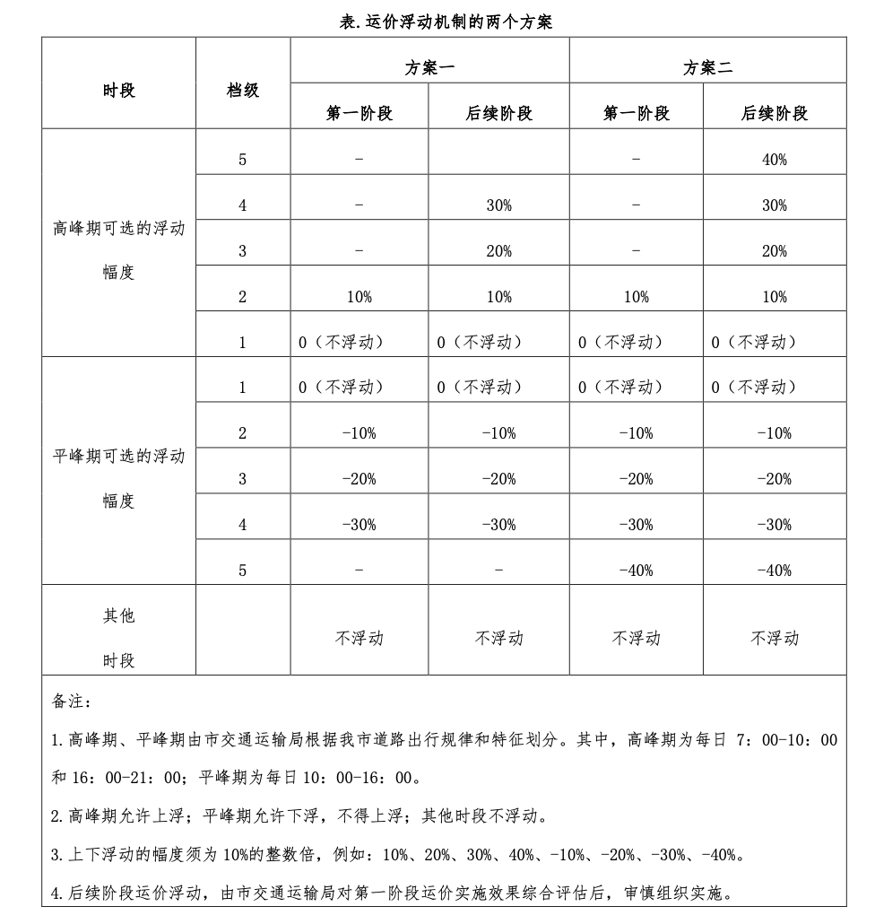 方案将按照分阶段方式进行实施,第一阶段:自行政规范性文件实施之日起启动实施。为稳妥推进政策,第一阶段高峰期浮动幅度控制在10%以内,平峰期运价下浮幅度适当扩大到30%(方案一)或40%(方案二)。后续阶段运价浮动按需启动,由市交通运输局对第一阶段运价实施效果综合评估后组织实施。