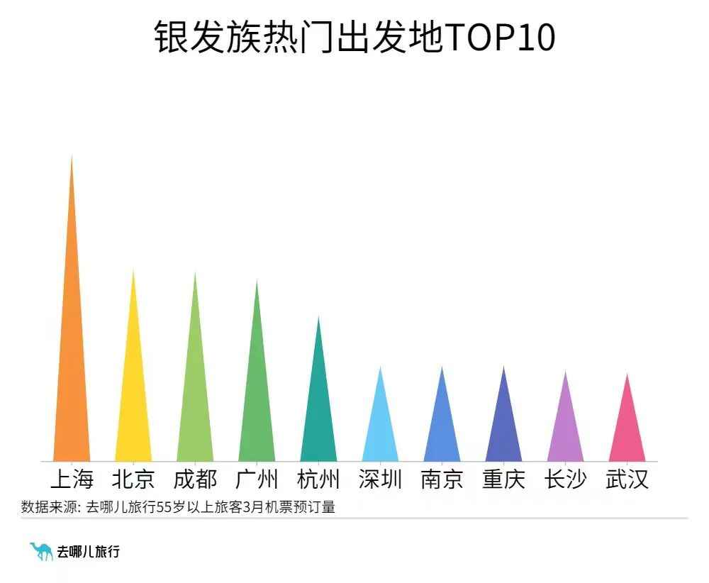 数据显示,上海、北京、成都、广州、杭州、深圳、南京、重庆、长沙、武汉等城市是银发族的重点客源地,银发族青睐的热门目的地则有上海、深圳、北京、成都、广州、杭州、昆明、西安、南京、重庆等。