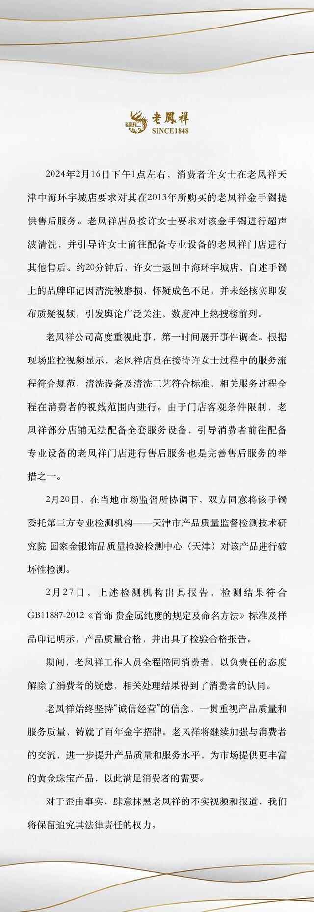 2月20日,双方同意将该手镯委托第三方专业检测机构进行检测。2月27日,上述检测机构出具报告,检测结果符合GB11887-2012《首饰 贵金属纯度的规定及命名方法》标准及样品印记明示,产品质量合格,并出具了检验合格报告。期间,老凤祥工作人员全程陪同,相关处理结果得到了消费者的认同。