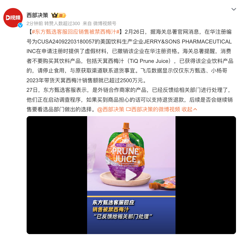2月27日,记者多次致电经销商为郑州麦绘商贸有限公司,电话无法接通。同日,东方甄选抖音橱窗中已无涉事商品,东方甄选客服回应记者称,已经没有售卖涉事产品。而“TiQ营养食品旗舰店”客服则告诉记者,产品100%西梅汁,无任何添加,所有产品均经过品质检查,如果不放心支持按照比例退货退款。